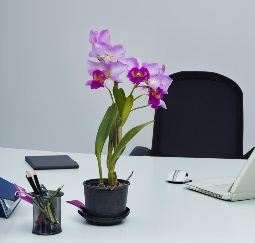 Las orquídeas dan un toque refinado y minimalista a cualquier oficina, y si quieres tener flores cerca de ti esta es una gran elección. Son plantas que se dan muy bien en interior, pero siempre cerca de una ventana. Las orquídeas Phalaenopsis suelen tener hojas largas de unos 20 centímetros, pero su versión en miniatura no necesita mucho espacio por ser pequeñas. Su impresionante floración puede disfrutarse varias veces al año.